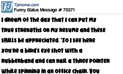 - # 30944 I dream of the day that I can put my true strengths on my resume and these skills be appreciated. "So I see here you're a bird's eye shot with a rubberband and can pluck a fly out of the air with your bare hands. You Sir, are what we called hired!"