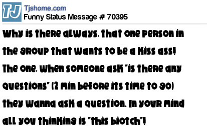 X is why is there always, that one person in the group that wants to be a kiss ass! The one, when someone ask "is there any questions" (2 min before its time to go) they wanna ask a question. In your mind all you thinking is "this biotch"!