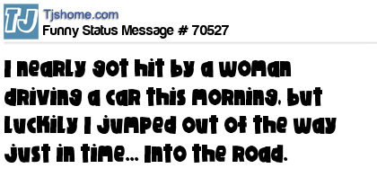 X I nearly got hit by a woman driving a car this morning, but luckily I jumped out of the way just in time... Into the road.