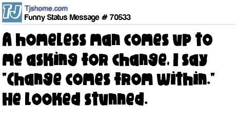 - # 64427 A homeless man comes up to asking for change,I say"change comes from within" he looked stunned.