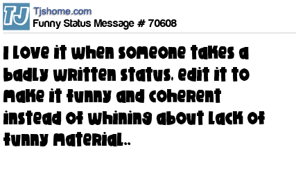 X says I love it when someone takes a badly written status, edit it to make it funny and coherent instead of whining about lack of funny material..