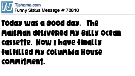 X says Today was a good day. The mailman delivered my Billy Ocean cassette. Now I have finally fulfilled my Columbia House commitment.