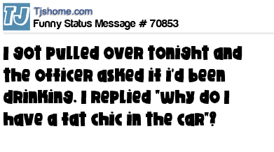 - # 80314 pulled over by the cops and they asked me if I had been drinking. I asked, "Why, is there a fat girl in the back?" He said, "Nope, there's two." I said, "Well, I guess I have!"