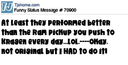X At least they performed better than the Ram pickup you push to Kragen every day...lol.----Okay, not original but I HAD to do it!