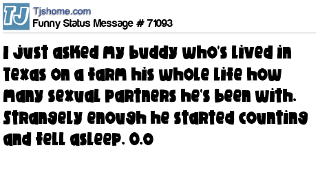X is I just asked my buddy who's lived in Texas on a farm his whole life how many sexual partners he's been with. Strangely enough he started counting and fell asleep. O.o