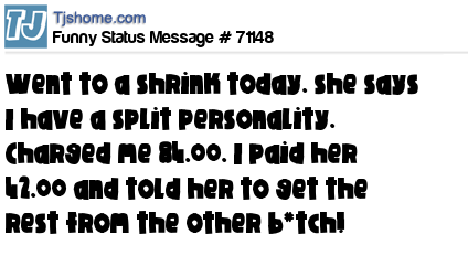 X is went to a shrink today. she says I have a split personality. Charged me 84.00. I paid her 42.00 and told her to get the rest from the other b*tch!