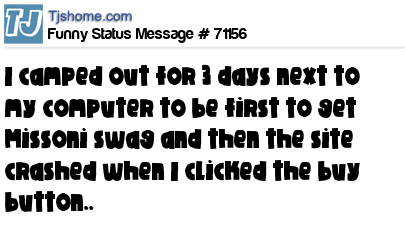 X I camped out for 3 days next to my computer to be first to get Missoni swag and then the site crashed when I clicked the buy button..