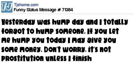 X says Yesterday was hump day and I totally forgot to hump someone. If you let me hump you today I may give you some money. Don't worry, it's not prostitution unless I finish