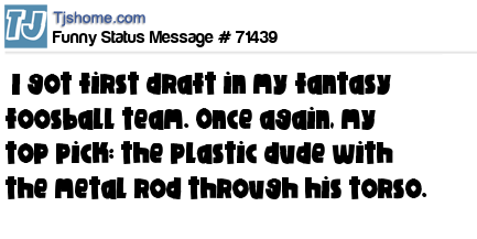 X says I got first draft in my fantasy foosball team. Once again, my top pick: the plastic dude with the metal rod through his torso.