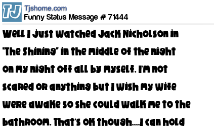 X  Well I just watched Jack Nicholson in "The Shining" in the middle of the night on my night off all by myself. I'm not scared or anything but I wish my wife were awake so she could walk me to the bathroom. That's ok though....I can hold it.