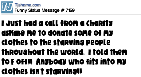 - # 10013 says I just had a call from a Charity asking me to donate some of my clothes to the starving people throughout the world. I told them to F off!! Anybody who fits into my clothes isn't starving!!