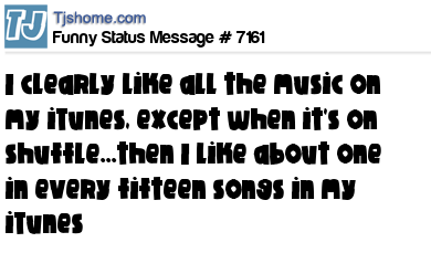 - # 5729 I like all of the music in my iTunes, except when it's on shuffle, then I like about one in every fifteen songs in my iTunes.