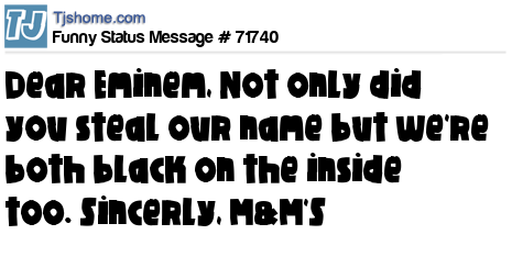 - # 126278 Dear Eminem, Not only did yousteal our name but we're both black on theinside too. Sincerly, M&M'S