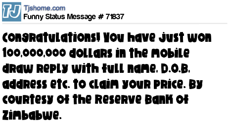 X says Congratulations! You have just won 100,000,000 dollars in the mobile draw reply with full name, D.O.B, address etc. to claim your price. By courtesy of the Reserve Bank of Zimbabwe.