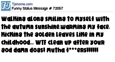 X is walking along smiling to myself with the autumn sunshine,warming my face, kicking the golden leaves like in my childhood... WTF clean up after your god damn dogs! mutha f***ers!!!!!!