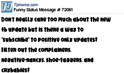 X is Don't really care too much about the new fb update but is there a way to "subscribe" to positive only updates? Filter out the complainers, negative-nancys, shoe-taggers, and crybabies?