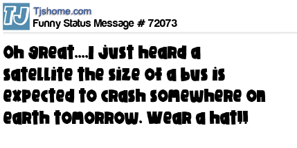 X Oh great....I just heard a satellite the size of a bus is expected to crash somewhere on earth tomorrow. Wear a hat!!