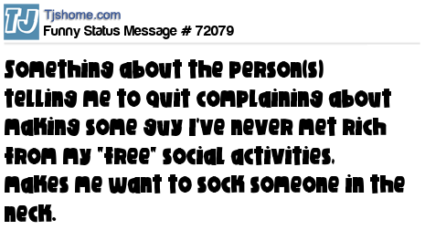 X Something about the person(s) telling me to quit complaining about making some guy I've never met rich from my "free" social activities, makes me want to sock someone in the neck.