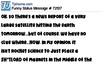 X is OK, so there's a news report of a very large satellite hitting the earth tomorrow...but of course, we have no clue where...NOW, In my opinion, it isn't rocket science to just place a SH*TLOAD of magnets in the middle of the desert....right?....JUST SAYING