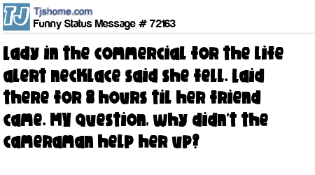 - # 72202 Lady in the commercial for the life alert necklace said she fell. Laid there for 8 hours til her friend came. Why didn't the cameraman help her up?