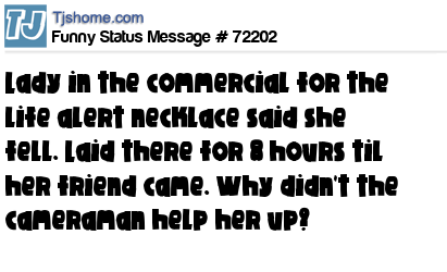 - # 72163 Lady in the commercial for the life alert necklace said she fell. Laid there for 8 hours til her friend came. MY question, why didn't the cameraman help her up?