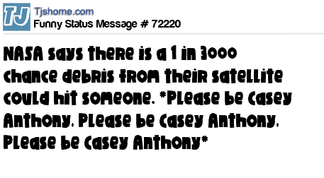 X says NASA says there is a 1 in 3000 chance debris from their satellite could hit someone. *Please be Casey Anthony, Please be Casey Anthony, Please be Casey Anthony*