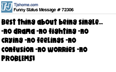 X is Best thing about being single… -no drama -no fighting -no crying -no feelings -no confusion -no worries -no PROBLEMS!