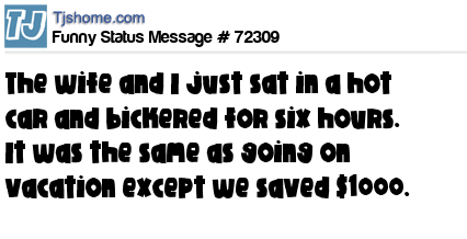 X is The wife and I just sat in a hot car and bickered for six hours. It was the same as going on vacation except we saved $1000.