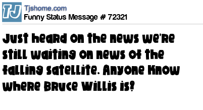 X Just heard on the news we're still waiting on news of the falling satellite. Anyone know where Bruce Willis is?
