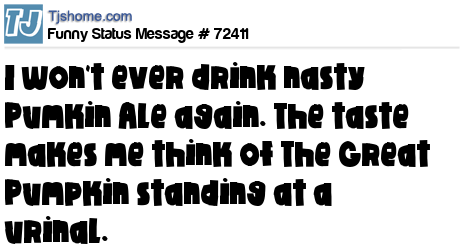 X I won't ever drink nasty Pumkin Ale again. The taste makes me think of The Great Pumpkin standing at a urinal.