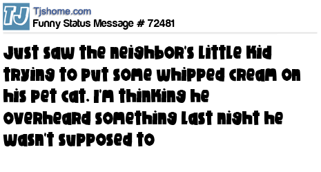 - # 70166 Just saw the neighbor's little kid trying to spray whipped cream on his pet cat. I'm thinking he overheard something last night he wasn't supposed to...