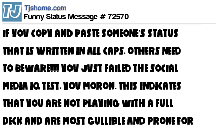X IF YOU COPY AND PASTE SOMEONE'S STATUS THAT IS WRITTEN IN ALL CAPS, OTHERS NEED TO BEWARE!!! YOU JUST FAILED THE SOCIAL MEDIA IQ TEST, YOU MORON. THIS INDICATES THAT YOU ARE NOT PLAYING WITH A FULL DECK AND ARE MOST GULLIBLE AND PRONE FOR COMPUTER HACKING
