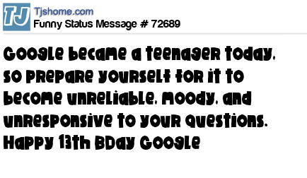 X says Google became a teenager today, so prepare yourself for it to become unreliable, moody, and unresponsive to your questions. Happy 13th BDay Google
