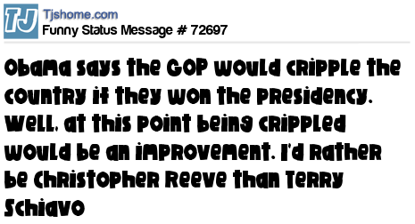 X is Obama says the GOP would cripple the country if they won the presidency. Well, at this point being crippled would be an improvement. I'd rather be Christopher Reeve than Terry Schiavo