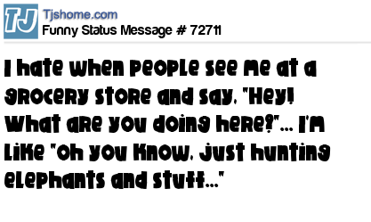 - # 134429 I hate it when people see me at the supermarket and they're like 'Hey, what are you doing here?' I tell them 'You know, hunting elephants.'