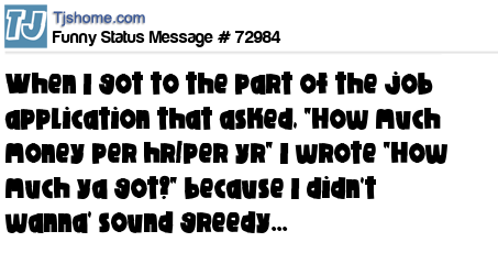 X When I got to the part of the job application that asked, "How much money per hr/per yr" I wrote "How much ya got?" because I didn't wanna' sound greedy...