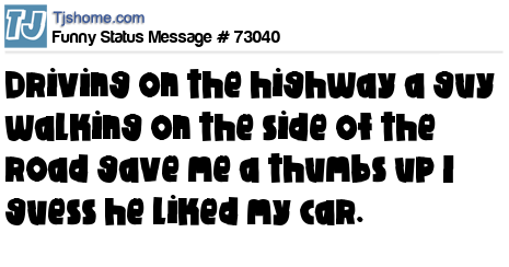 X is Driving on the highway a guy walking on the side of the road gave me a thumbs up I guess he liked my car.