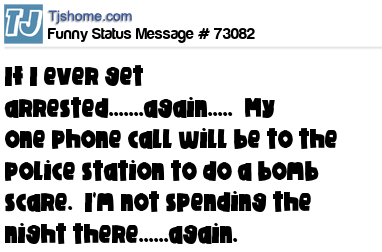 - # 73102 If I ever get arrested, my one phone call will be to the police station to do a bomb scare. I'm not spending the night there