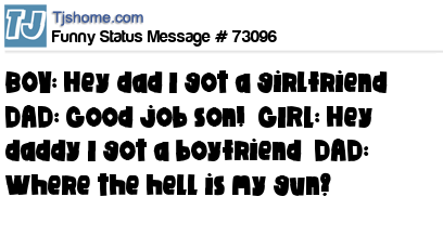 X BOY: Hey dad I got a girlfriend DAD: Good job son! GIRL: Hey daddy I got a boyfriend DAD: Where the hell is my gun?