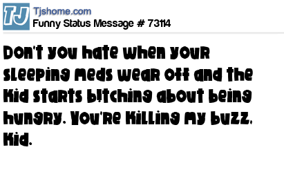X Don't you hate when your sleeping meds wear off and the kid starts b!tching about being hungry. You're killing my buzz, kid.