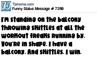 X I'm standing on the balcony throwing skittles at all the workout freaks running by. You're in shape. I have a balcony. And skittles. I win.