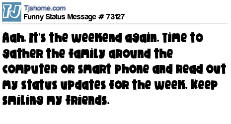 X Aah, It's the weekend again. Time to gather the family around the computer or smart phone and read out my status updates for the week. Keep smiling my friends.