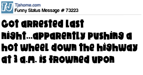 X got arrested last night...apparently pushing a hot wheel down the highway at 3 a.m. is frowned upon