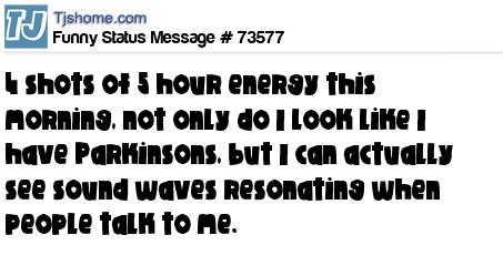 X is 4 shots of 5 hour energy this morning, not only do I look like I have Parkinsons, but I can actually see sound waves resonating when people talk to me.