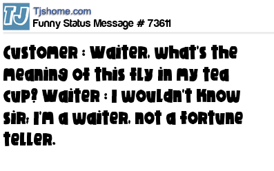 X is Customer : Waiter, what's the meaning of this fly in my tea cup? Waiter : I wouldn't know sir; I'm a waiter, not a fortune teller.