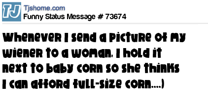 X Whenever I send a picture of my wiener to a woman, I hold it next to baby corn so she thinks I can afford full-size corn....)