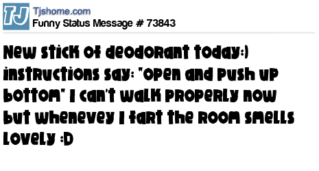 - # 20986 I got a new stick deodorant today. The instructions said: Remove cap and push up bottom. I can barely walk, but whenever I fart the room smells lovely.