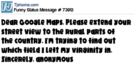 X is Dear Google Maps, Please extend your street view to the rural parts of the country. I'm trying to find out which field I left my virginity in. Sincerely, anonymous