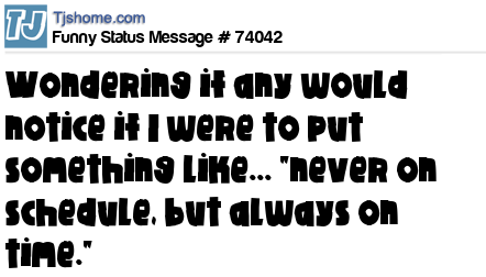 X is wondering if any would notice if I were to put something like... "never on schedule, but always on time."