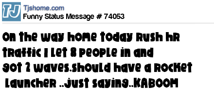 X On the way home today rush hr traffic I let 8 people in and got 2 waves.should have a rocket launcher ..just saying..KABOOM